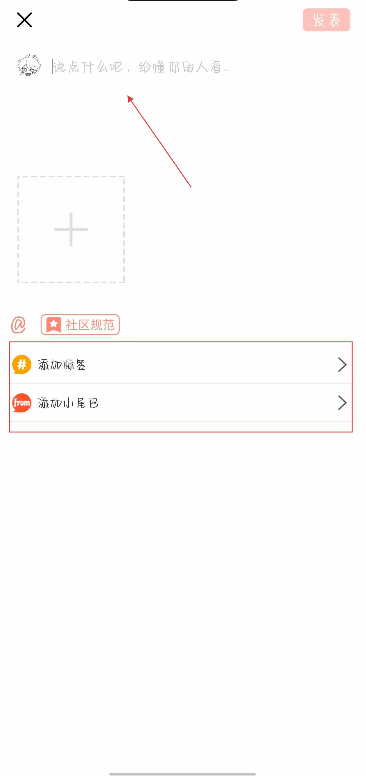 3、在動態(tài)編輯頁面的輸入框中,輸入要發(fā)布的內(nèi)容,也可點擊添加標(biāo)簽,添加小尾巴進(jìn)行個性化設(shè)置。