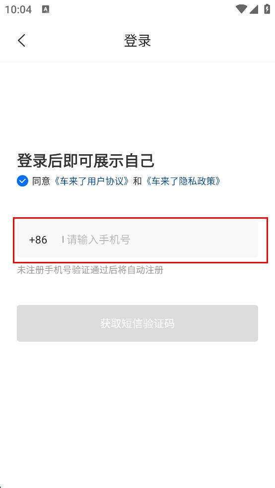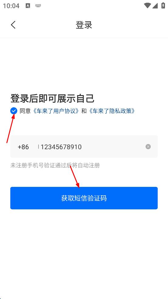 4、勾選同意車來了用戶協(xié)議和車來了隱私政策,然后點(diǎn)擊的“獲取短信驗(yàn)證碼”按鈕。