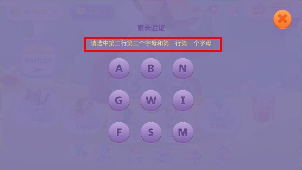2、在家長驗證界面,根據(jù)提示選中字母,完成驗證進入設(shè)置頁面。