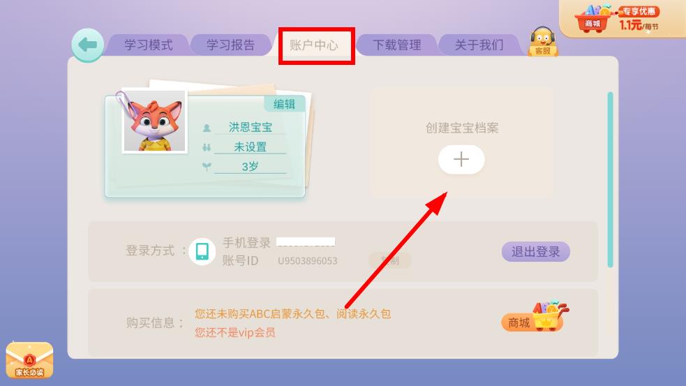 3、在設(shè)置頁面中,點擊賬戶中心選項,進入賬戶中心界面,在賬戶中心界面里,點擊創(chuàng)建寶寶檔案。