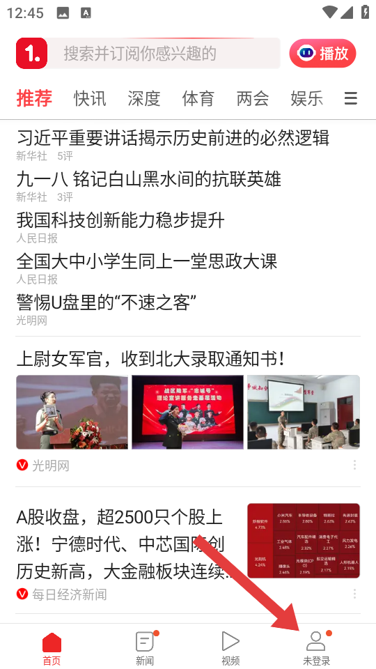1、打開一點(diǎn)資訊APP,點(diǎn)擊底部未登錄,進(jìn)入個(gè)人的界面。