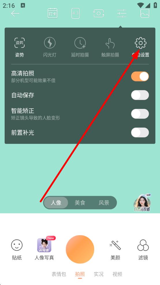 2、在拍攝設(shè)置頁面中,點(diǎn)擊右上角齒輪狀的拍攝設(shè)置選項(xiàng),進(jìn)入更詳細(xì)的設(shè)置界面。