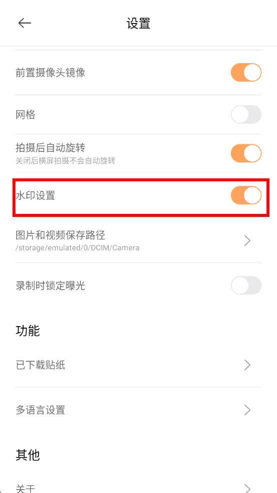 3、在詳細(xì)設(shè)置界面里,找到水印設(shè)置選項(xiàng),點(diǎn)擊關(guān)閉其右側(cè)的按鈕,即可在拍攝時(shí)去除無他相機(jī)水印。