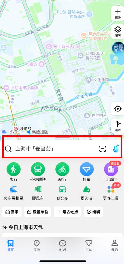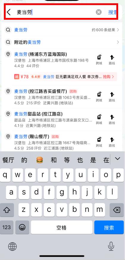 1、打開高德地圖APP,在首頁頂部搜索欄中,輸入要搜索的店鋪名稱,如上海市麥當(dāng)勞。