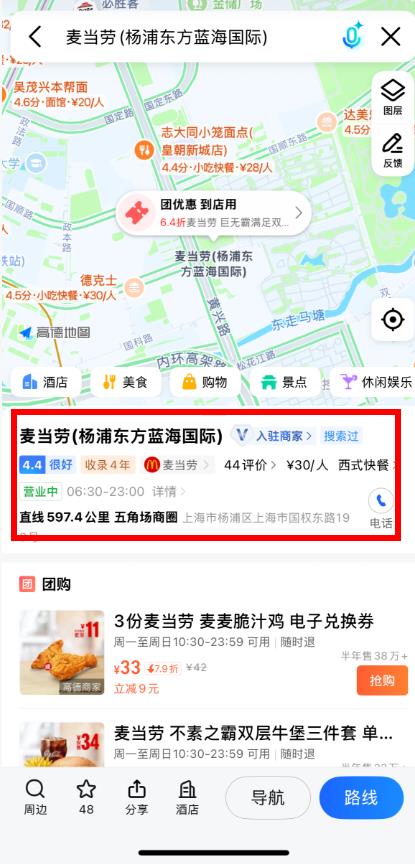 3、在搜索結(jié)果列表中,點(diǎn)擊想要查看的店鋪,如麥當(dāng)勞楊浦東方藍(lán)海國際,即可進(jìn)入該店鋪詳情頁,查看店鋪評分、營業(yè)時間、地址等信息。