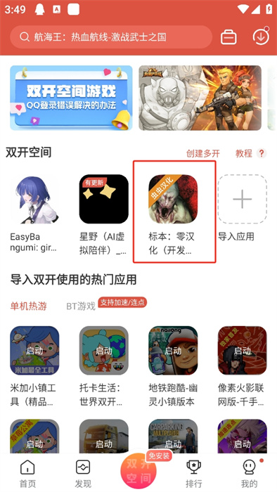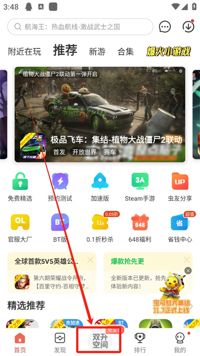 1、想要使用雙開空間功能,就需要你的蟲蟲助手是最新版本,然后在軟件的首頁界面點(diǎn)擊下方中間的【雙開空間】;