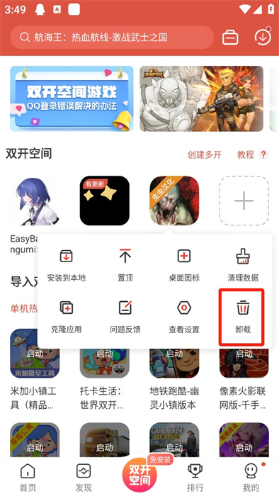 3、長安游戲圖標(biāo)后,會出現(xiàn)一個彈窗,在彈窗中最后一個功能就是【卸載】就算你手機(jī)已經(jīng)卸載了該游戲,但是雙開空間中還會有,需要我們卸載一下;