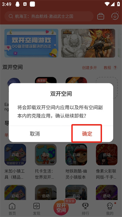 4、最后刪除彈窗會詢問我們是否卸載,在這里我們直接點(diǎn)擊【確定】就可以直接在雙開空間中卸載游戲了。