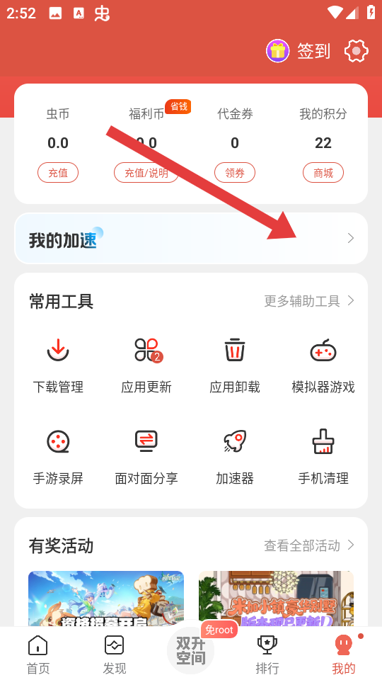 1、打開蟲蟲助手APP,進(jìn)入我的頁面,點(diǎn)擊我的加速選項,進(jìn)入加速管理的頁面。