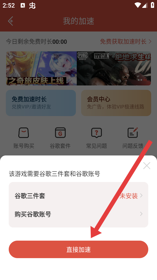 3、若游戲需谷歌三件套,可以選擇安裝谷歌三件套、購買谷歌賬號或直接點(diǎn)擊直接加速的按鈕。