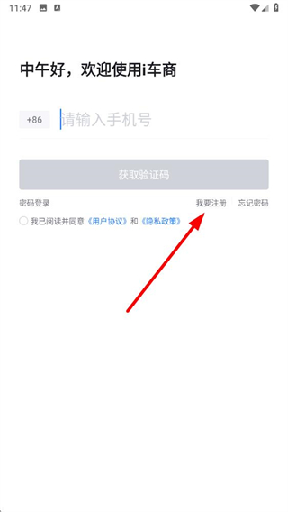 1、打開i車商app,在登錄界面點(diǎn)擊我要注冊選項(xiàng)進(jìn)入注冊頁面。