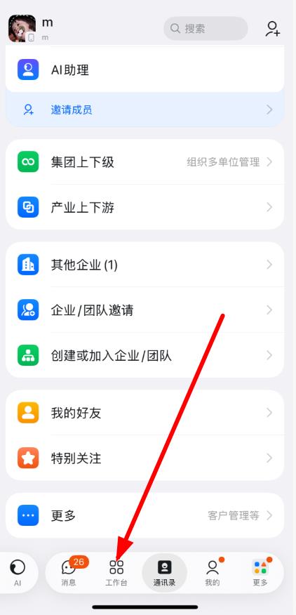 1、打開(kāi)釘釘應(yīng)用,點(diǎn)擊底部導(dǎo)航欄中的工作臺(tái)進(jìn)入工作臺(tái)頁(yè)面。
