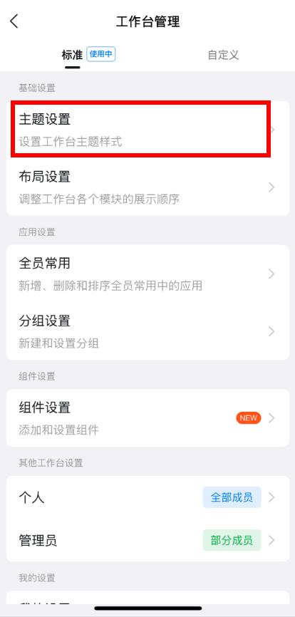 3、在工作臺(tái)管理界面中,找到并點(diǎn)擊主題設(shè)置選項(xiàng)。