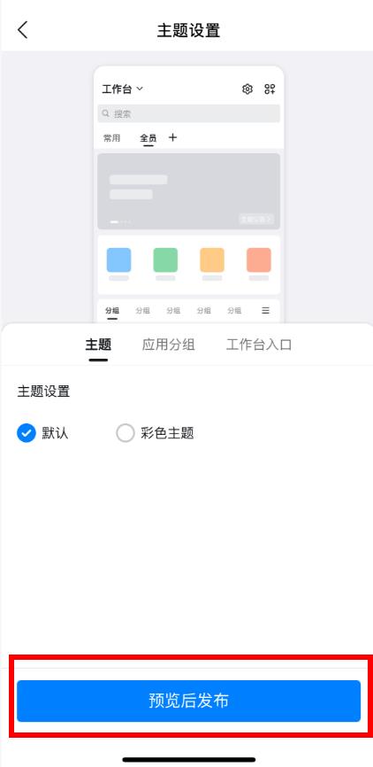 4、在主題設(shè)置頁(yè)面,選擇彩色主題,點(diǎn)擊預(yù)覽后發(fā)布,即可將釘釘工作臺(tái)主題設(shè)置為彩色。
