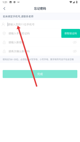 3、在進入到忘記密碼頁面中,需先點擊上方輸入框填寫手機號,以便獲取驗證碼進行驗證。
