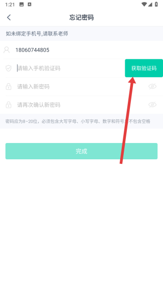 4、填寫好手機號時點擊獲取驗證碼,等待填寫驗證碼后,即可重新設置新密碼。