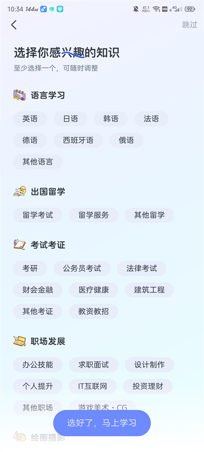 3、登錄成功進入知識興趣選擇界面,在這里可以選擇語言學(xué)習(xí)、出國留學(xué)、考試考證等多個版塊內(nèi)容;