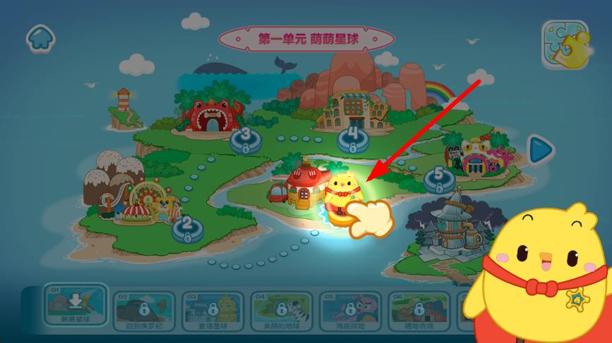 2、進(jìn)入學(xué)習(xí)單元頁面,如第一單元萌萌星球,跟隨指引點擊相應(yīng)的學(xué)習(xí)關(guān)卡,像圖中被點亮指引的位置。