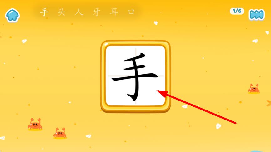 3、進(jìn)入具體的識字頁面后,會展示要學(xué)習(xí)的漢字,比如手字,按照頁面引導(dǎo)完成認(rèn)讀、書寫等學(xué)習(xí)任務(wù)。