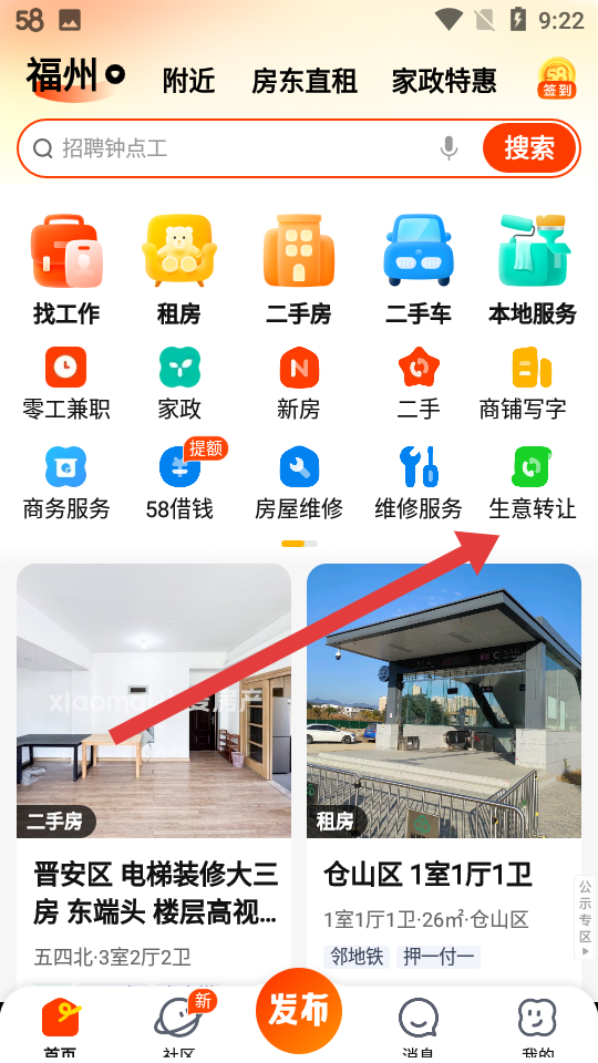 1、打開58同城進入首頁后點擊生意轉(zhuǎn)讓圖標,位于功能欄第三行最右側(cè),進入商鋪轉(zhuǎn)讓信息的頁面。
