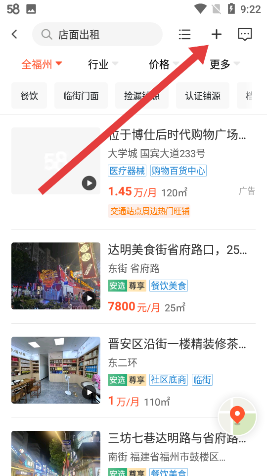 2、在商鋪轉(zhuǎn)讓的頁面,我們需要點擊右上角+號按鈕,進入商鋪信息發(fā)布分類的選擇界面。