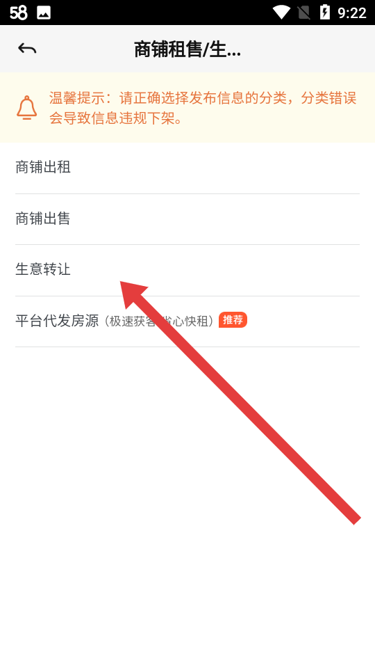3、在分類列表中,點擊生意轉(zhuǎn)讓選項,進入信息填寫頁面,后續(xù)依次填寫信息,等待審核通過即可發(fā)布廣告。