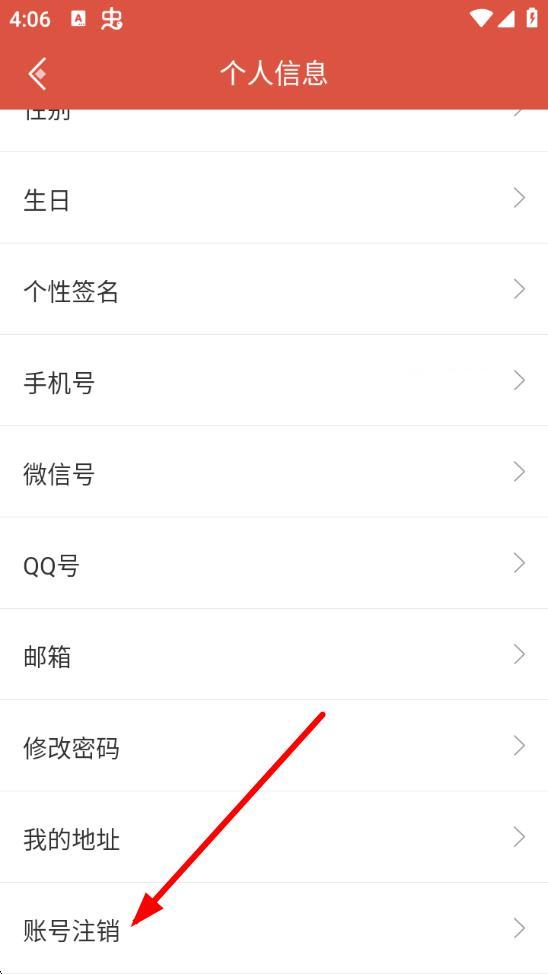 2、在個人信息頁面,向下滑動找到賬號注銷選項,點擊進(jìn)入賬號注銷申請頁面。