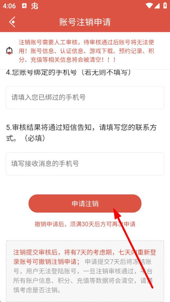 3、在賬號注銷申請頁面,按要求填寫完成后點擊申請注銷按鈕。注銷提交審核后有7天考慮期,7天后賬號將凍結(jié)無法登錄,審核通過后賬號相關(guān)信息將被清空。