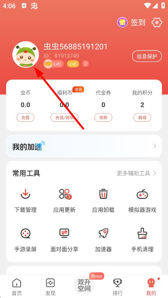1、打開蟲蟲助手應(yīng)用,點擊底部導(dǎo)航欄中的我的,進(jìn)入個人頁面,點擊左上角頭像區(qū)域。