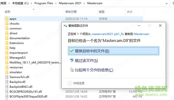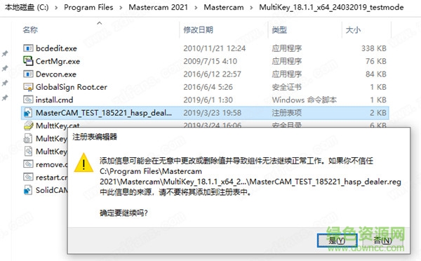 6.不要運(yùn)行這個(gè)軟件,將MultiKey_18.1.1_x64_24032019_testmode文件夾復(fù)制到軟件安裝目錄下,再運(yùn)行MasterCAM_TEST_185221_hasp_dealer.reg添加注冊表信息