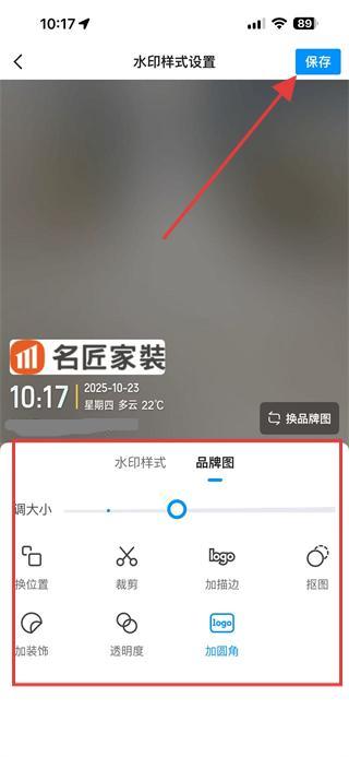 4.選擇品牌圖后,可調(diào)整水印樣式如大小、位置、裝飾等,調(diào)整完成后點(diǎn)擊右上角保存按鈕,完成品牌圖修改。
