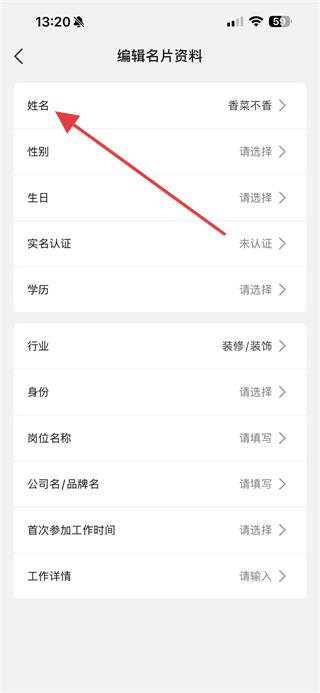 4、在編輯名片資料頁面,點(diǎn)擊姓名選項(xiàng),輸入新姓名即可完成修改。