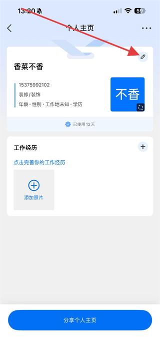 3、在個(gè)人主頁中,點(diǎn)擊編輯圖標(biāo)進(jìn)入編輯名片資料頁面。