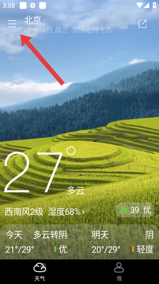 1、在新晴天氣主界面,點(diǎn)擊左上角的三條橫線菜單按鈕,進(jìn)入我的城市頁(yè)面。