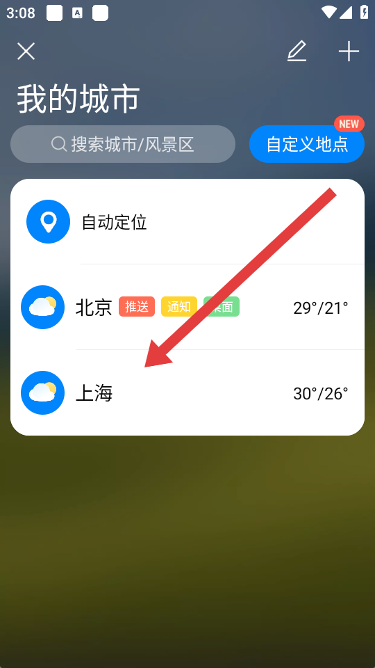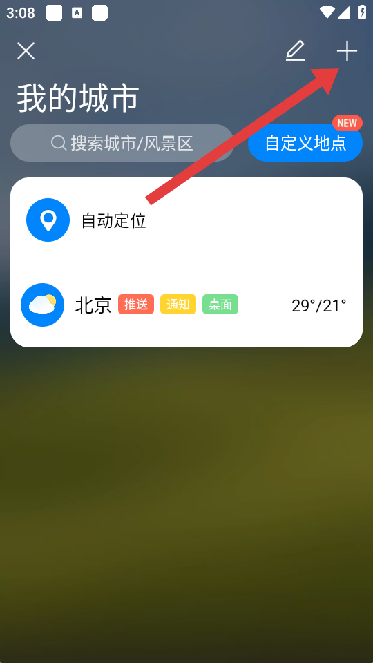 2、在我的城市頁(yè)面,點(diǎn)擊右上角的+號(hào)圖標(biāo),進(jìn)入城市搜索與選擇界面。