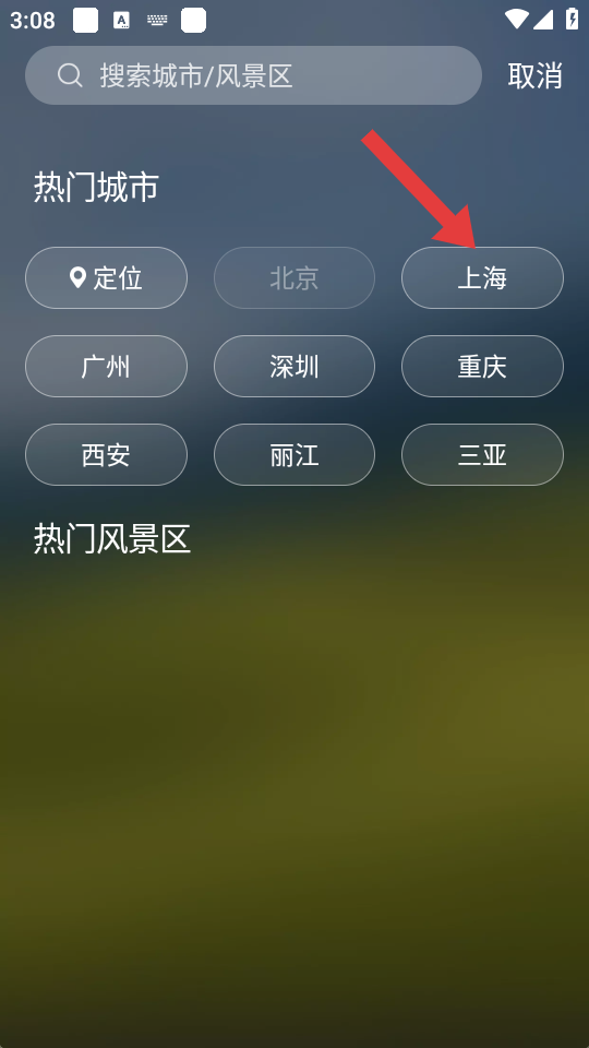 3、在城市選擇界面的熱門(mén)城市區(qū)域,點(diǎn)擊要添加的城市如上海。