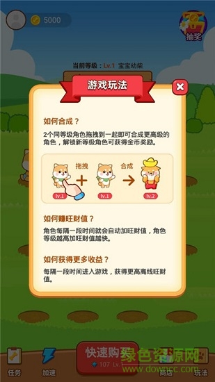 1.合成養(yǎng)狗狗的趣味小游戲,升級(jí)相同的小狗,解鎖更高等級(jí)的狗狗