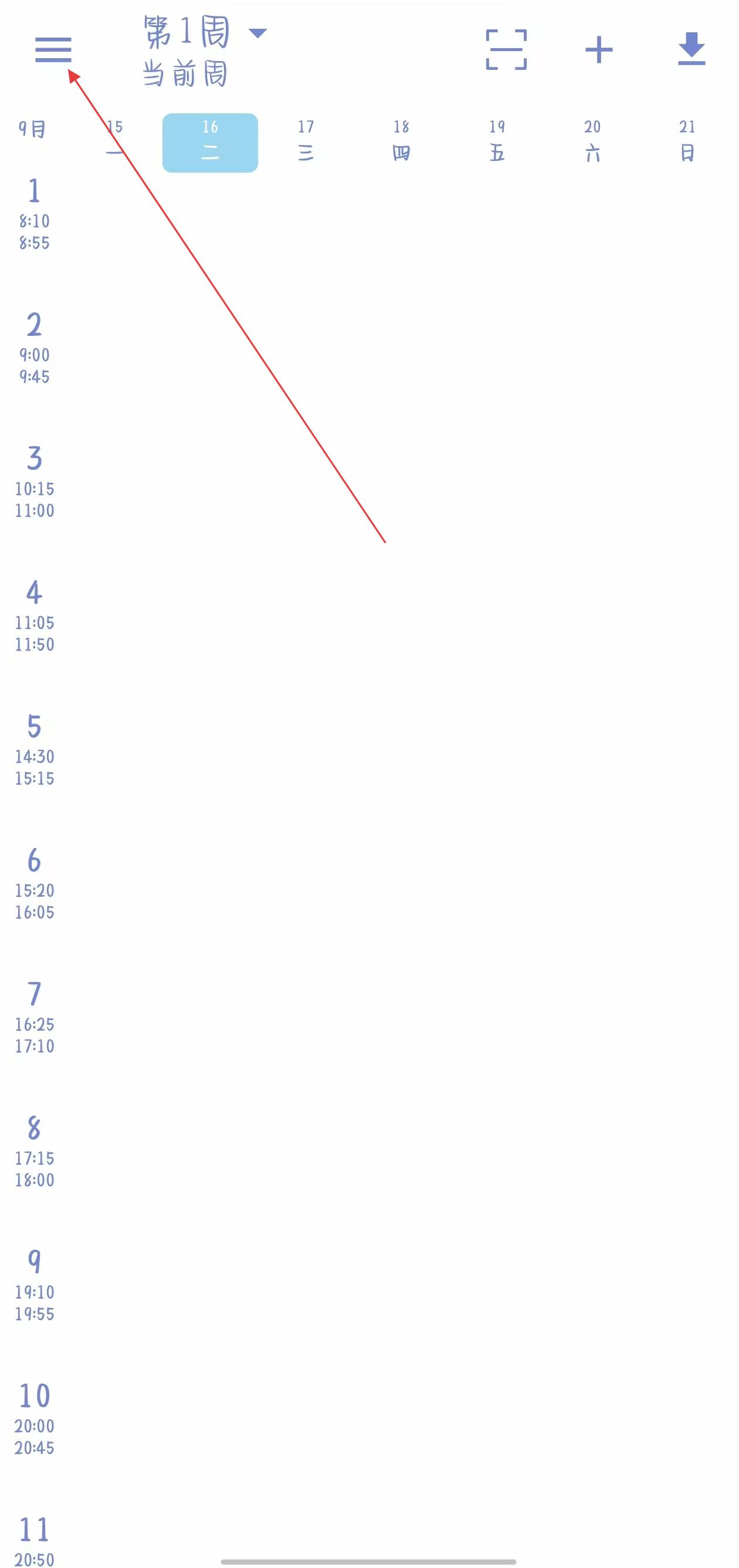 1、打開Simple課程表,點(diǎn)擊界面左上角三條橫線樣式的菜單按鈕,展開側(cè)邊欄菜單。