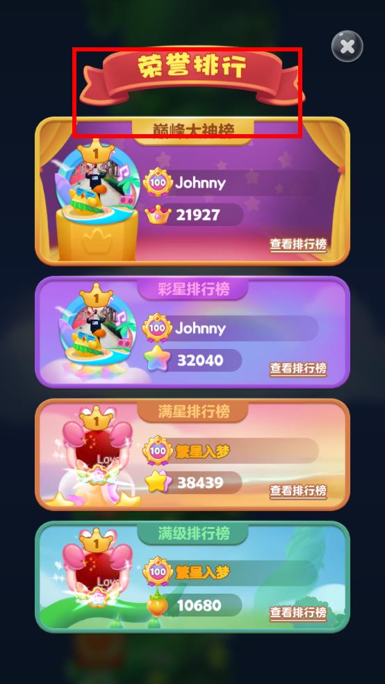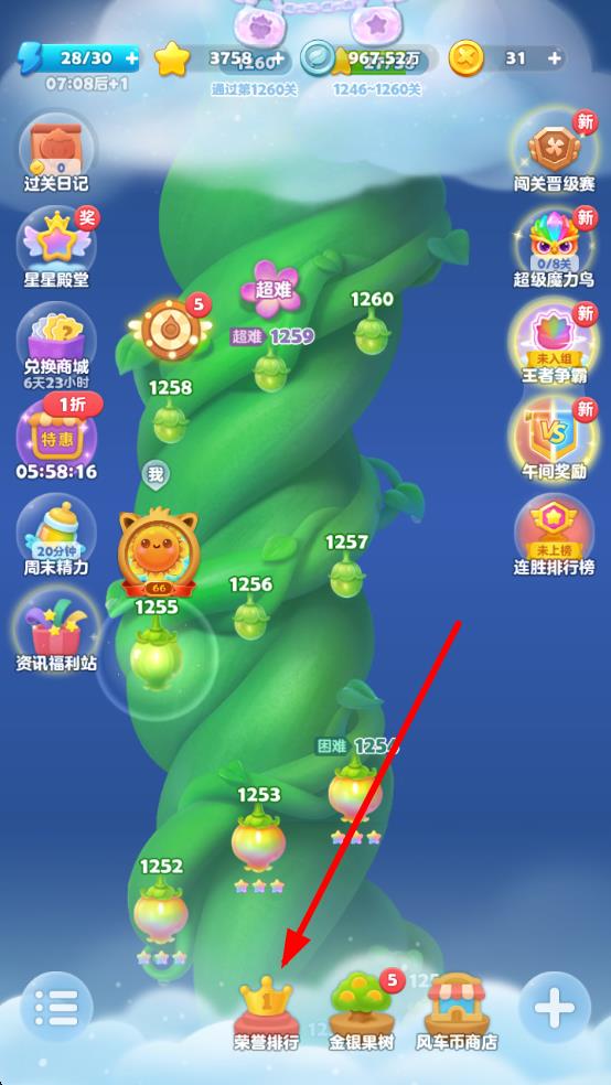 1、打開開心消消樂游戲,在主界面點擊下方的榮譽排行按鈕,進入榮譽排行界面。
