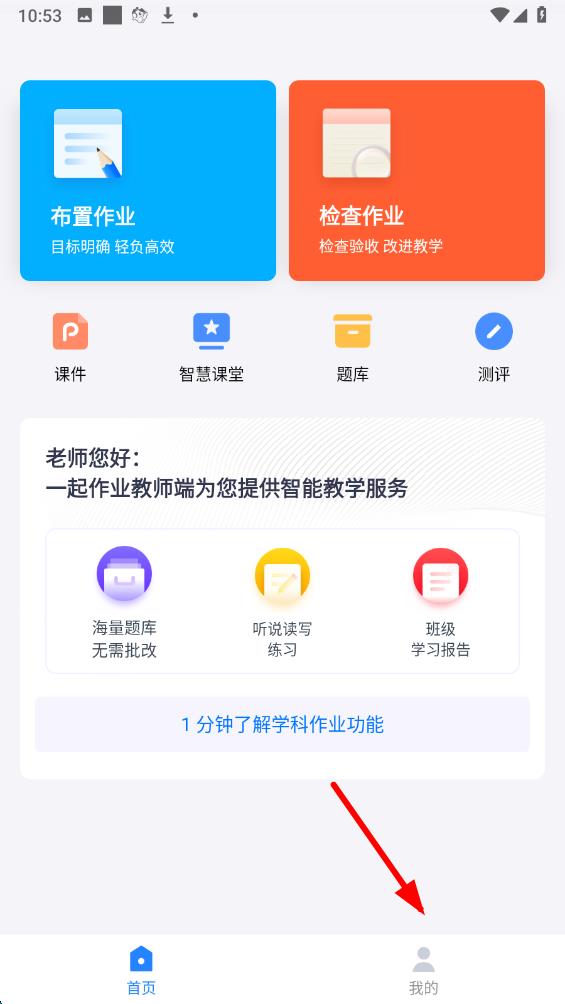 1、打開一起作業(yè)教師端app,點擊底部導(dǎo)航欄中的我的選項,進入個人中心頁面。