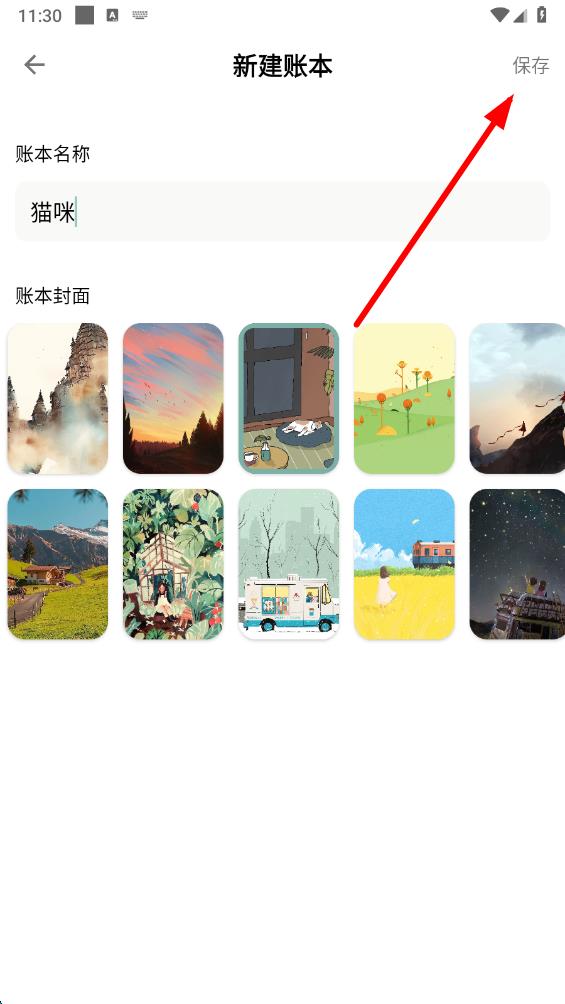 4、在新建賬本界面,輸入賬本名稱,選擇喜歡的賬本封面,然后點(diǎn)擊右上角的保存按鈕,即可成功新建賬本。