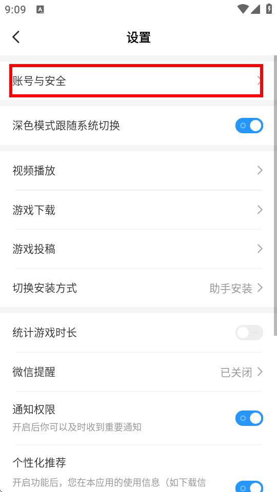 2、在設(shè)置界面中,點擊賬號與安全進(jìn)入賬號與安全設(shè)置頁。