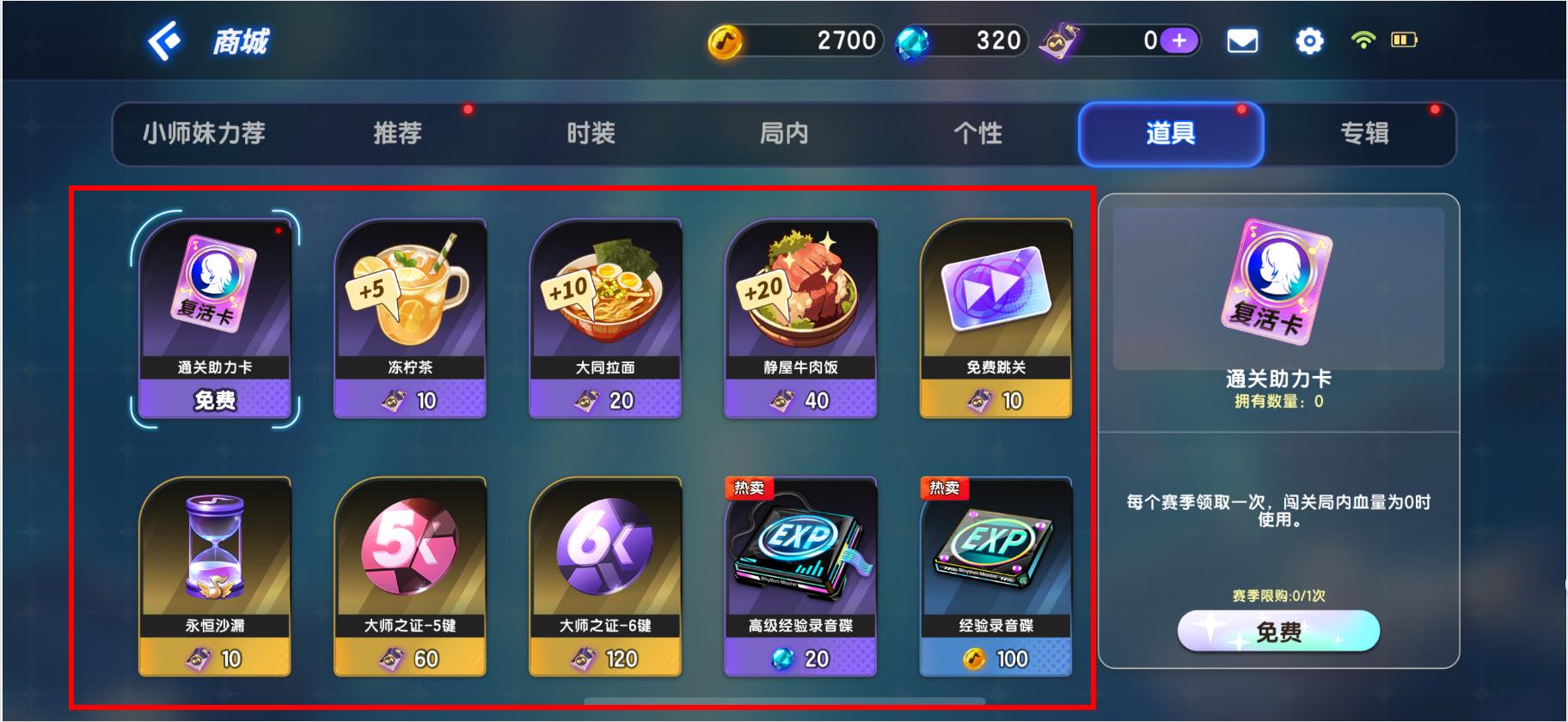 3、在道具頁面,可看到多種道具,如復(fù)活卡、凍檸茶等。