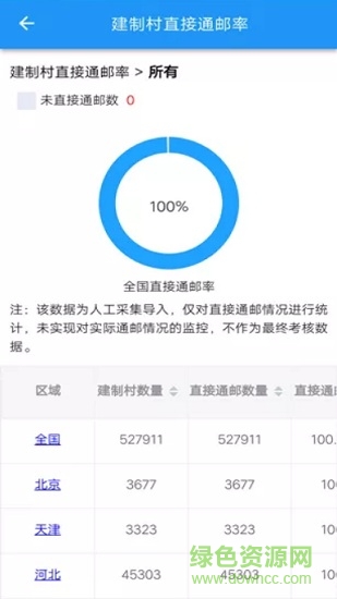 點(diǎn)擊【建制村直接通郵率】可查看建制村直接通郵率情況。點(diǎn)擊“省份(市、縣)”可查看下級(jí)各地區(qū)統(tǒng)計(jì)情況。