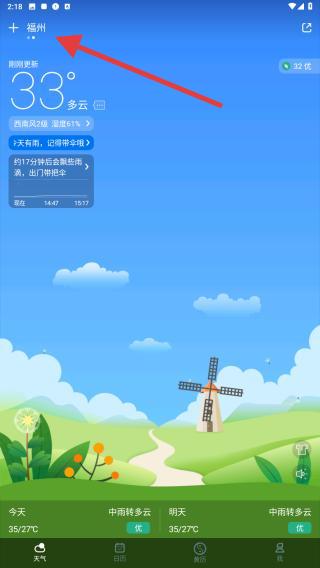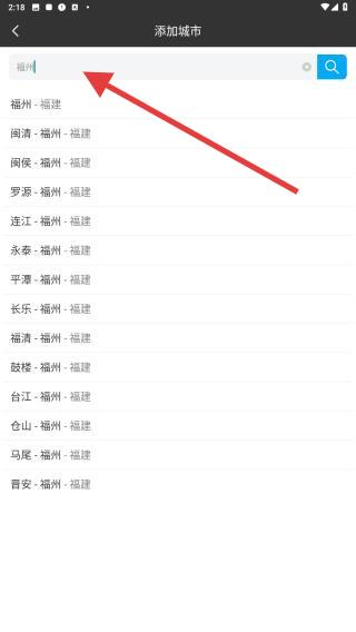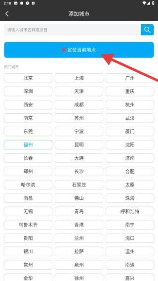 3、添加后,首頁(yè)左上角會(huì)顯示已定位城市如第三張圖福州,點(diǎn)擊可展開城市列表,切換查看不同地區(qū)天氣。