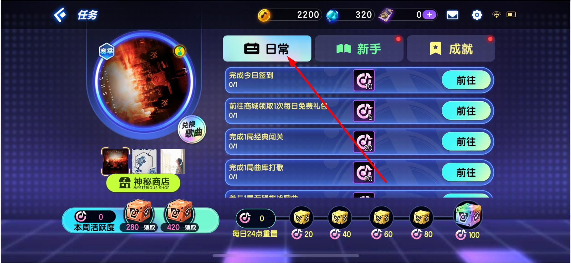 2、在任務(wù)界面中點(diǎn)擊日常選項(xiàng)卡,完成如簽到、商城領(lǐng)禮包、闖關(guān)、打歌等日常任務(wù),可獲取對(duì)應(yīng)數(shù)量的金幣獎(jiǎng)勵(lì)