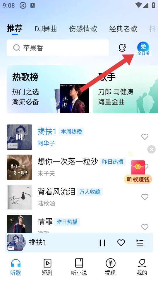 1、打開酷狗大字版APP,在首頁找到并點擊全日聽按鈕,觸發(fā)免費聽歌權(quán)益彈窗。