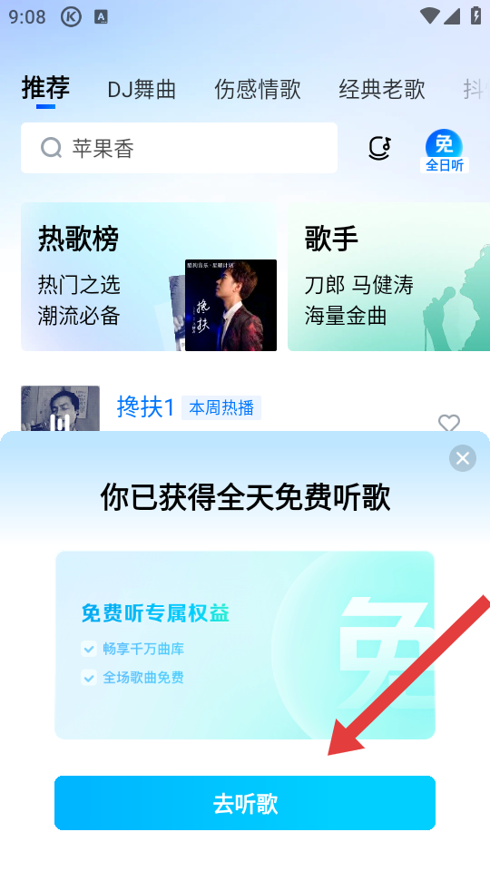2、在彈出的你已獲得全天免費聽歌的彈窗中,點擊去聽歌,進(jìn)入歌曲播放準(zhǔn)備流程。