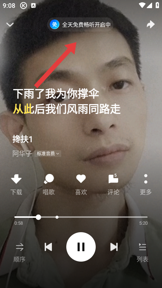 3、進(jìn)入歌曲播放界面后,界面顯示全天免費暢聽開啟中,即可免費播放歌曲,享受音樂。