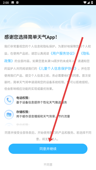 1、在打開app后,可以通過點擊同意并繼續(xù)按鈕,進入使用。